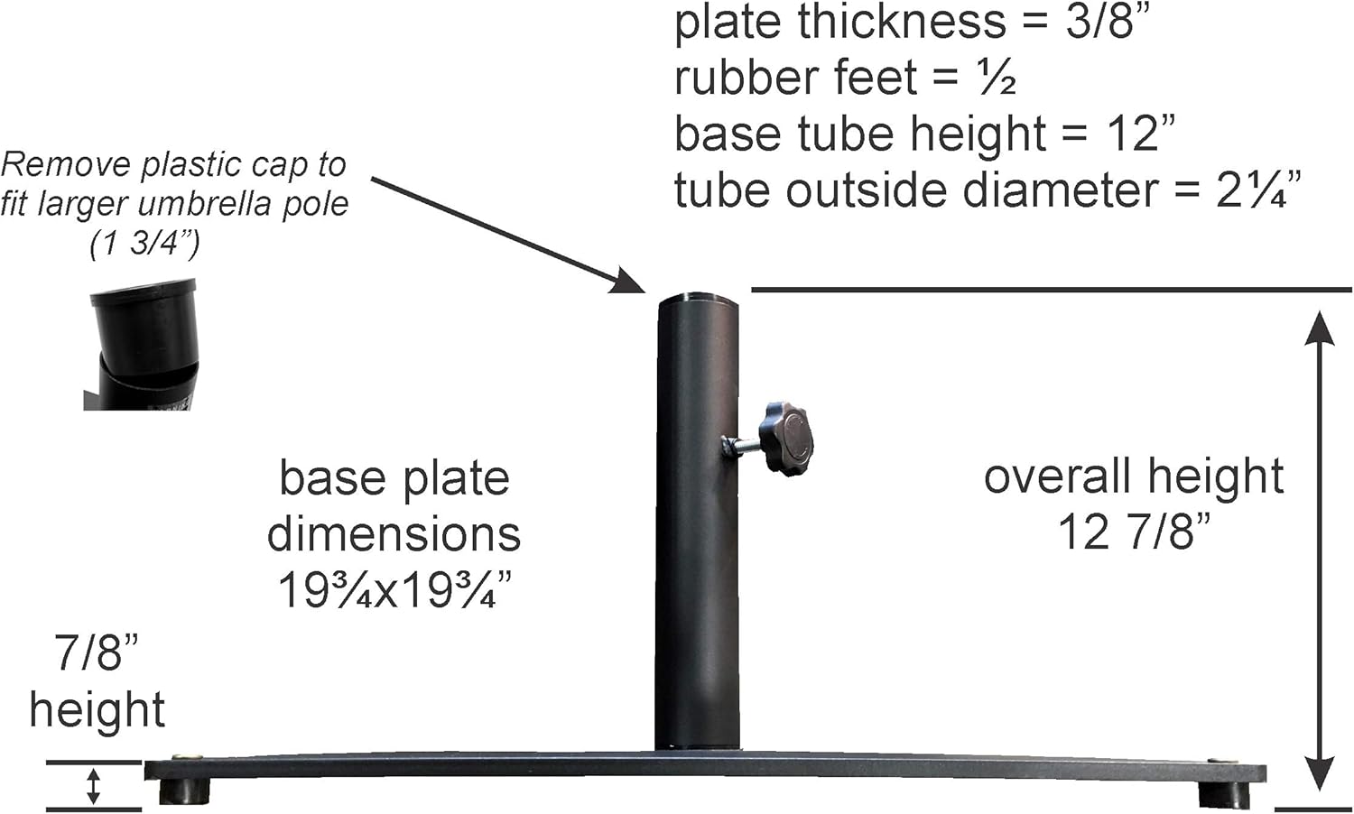 Use this versatile TropiShade steel umbrella base to keep your patio umbrella firmly in place. This heavy duty square umbrella base has a weather-resistant design, so you can keep it outdoors all year round. It can fit most of outdoor furniture's because it's less than 1" thickness and fit under table easily. The unit's screw mechanism keeps your umbrella securely attached to the base even in a windy conditions. Fit all kinds of umbrellas including tropishade umbrellas.