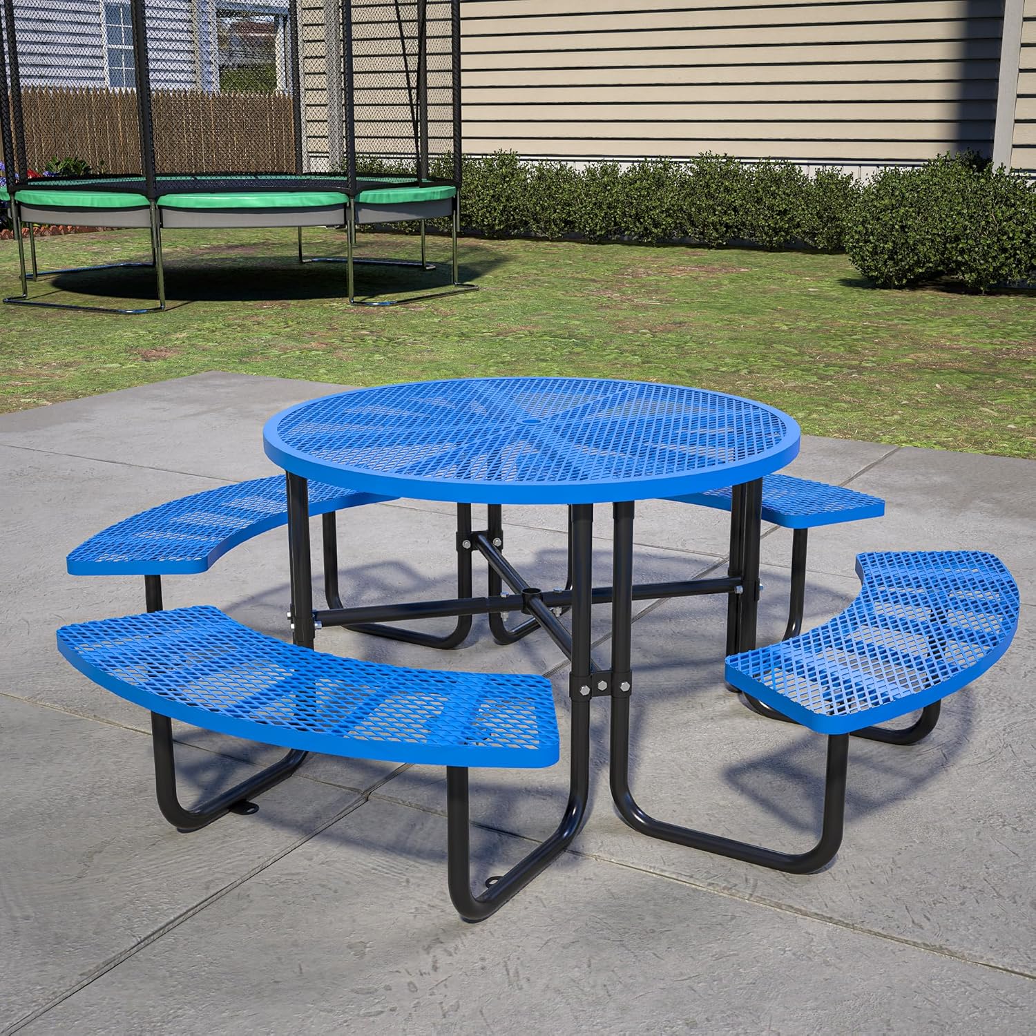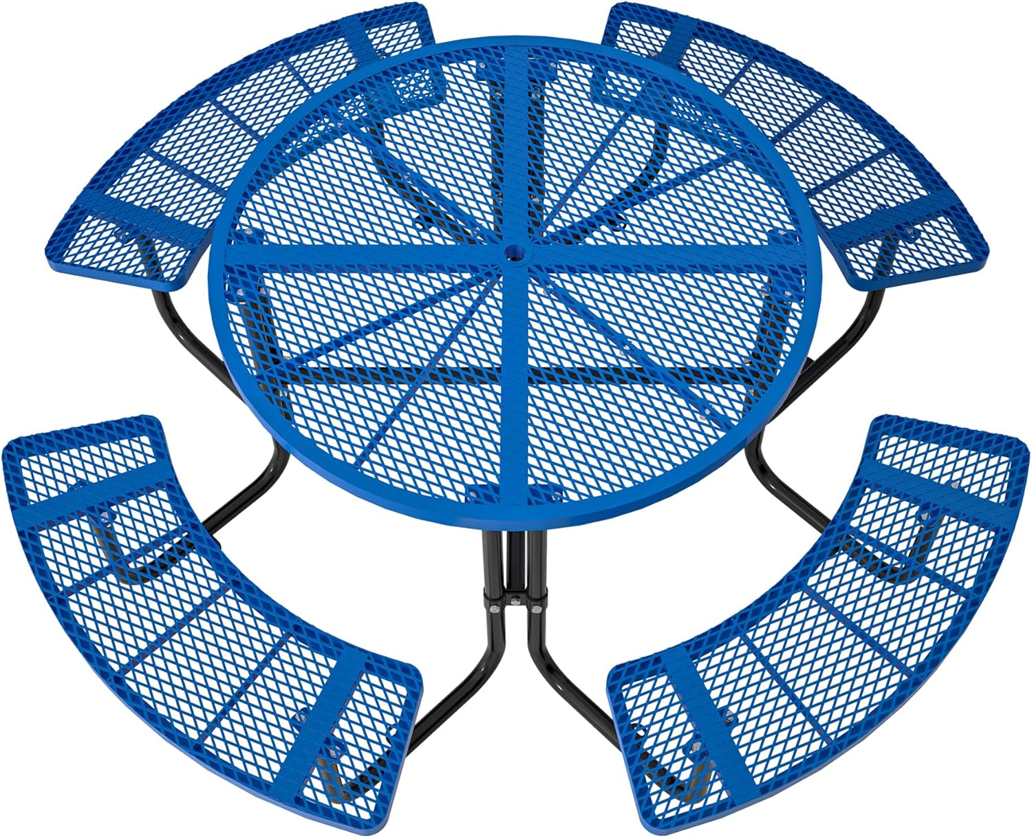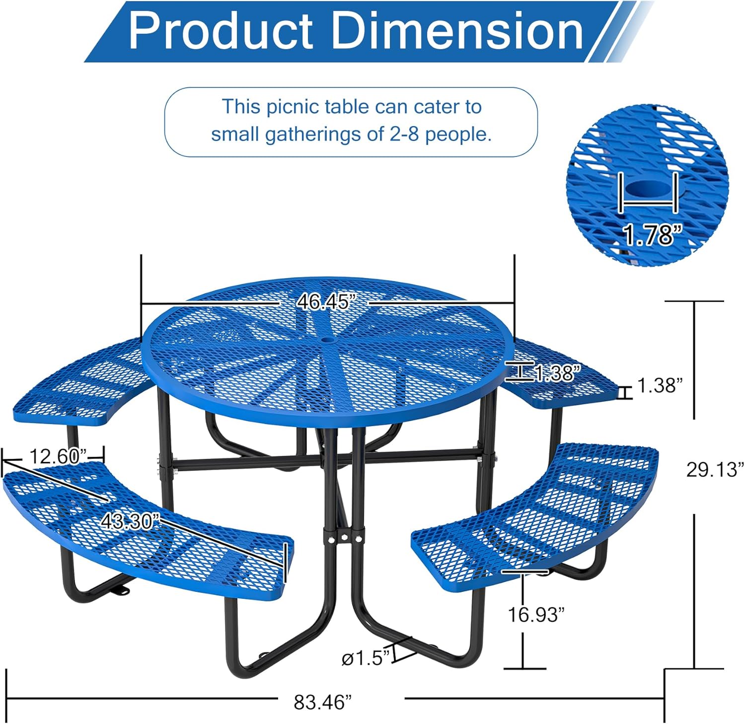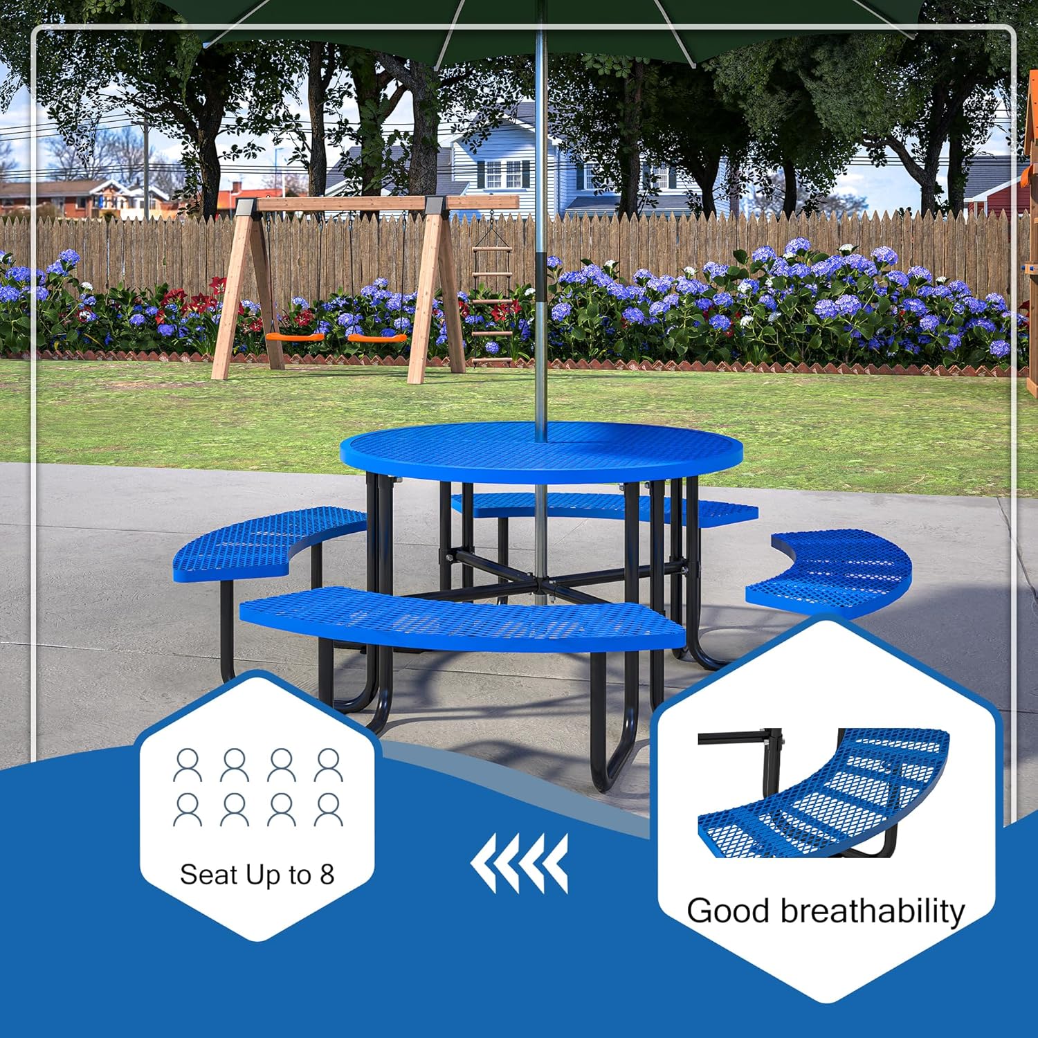 46" Round Metal Picnic Tables for Outdoors with Umbrella Hole Stainless Steel Commercial Grade Table with Seats, 8 Person Open Air Top Round Portable Outdoor Patio Picnic Table Furniture, Blue