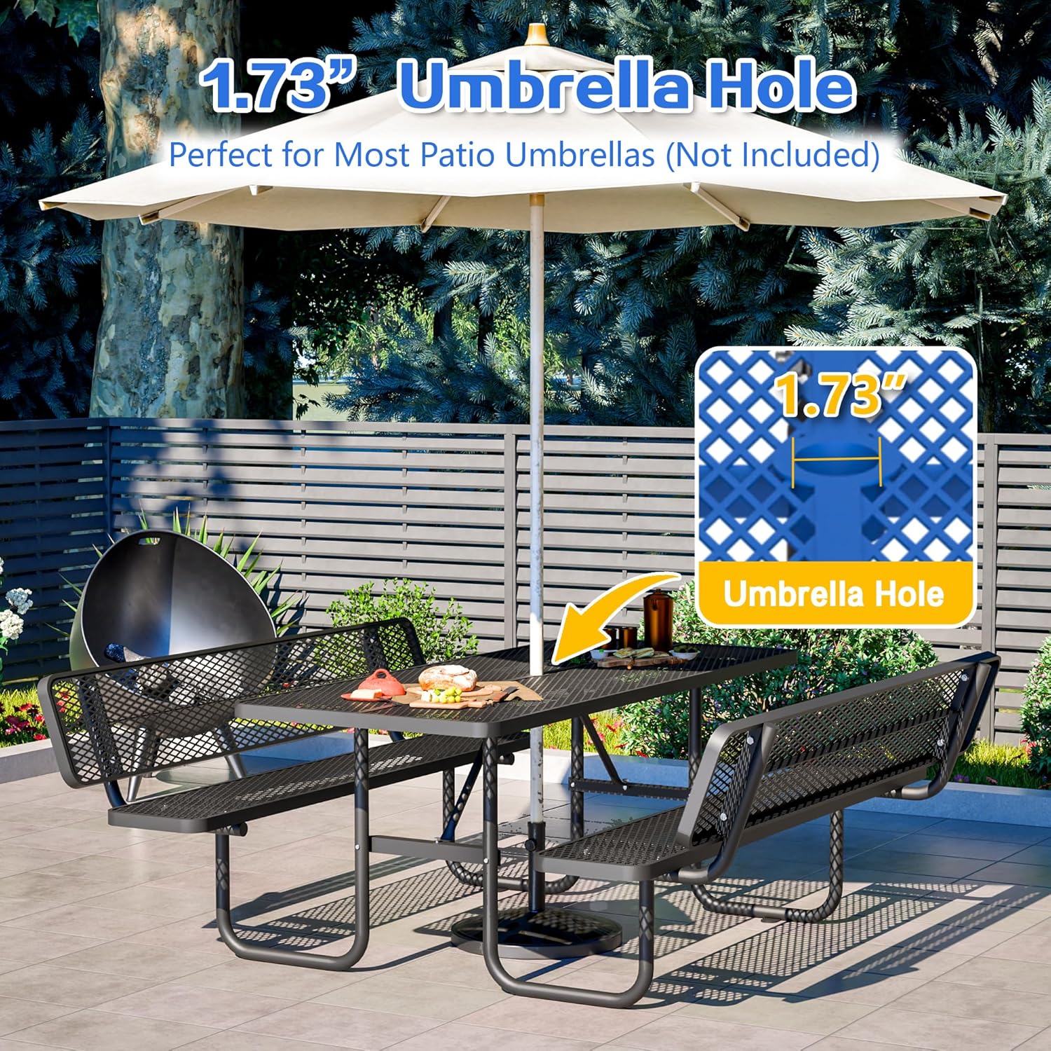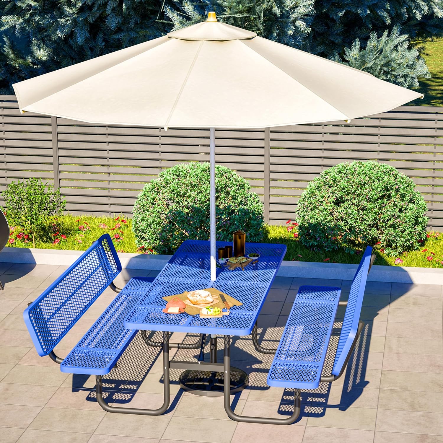 ItWorths 72" Outdoor Expanded Metal Picnic Table with Backrest, Heavy Duty Rectangular Patio Table with Umbrella Hole for BBQ Lawn Park Backyard Garden Commercial, Thermoplastic Coating, Blue