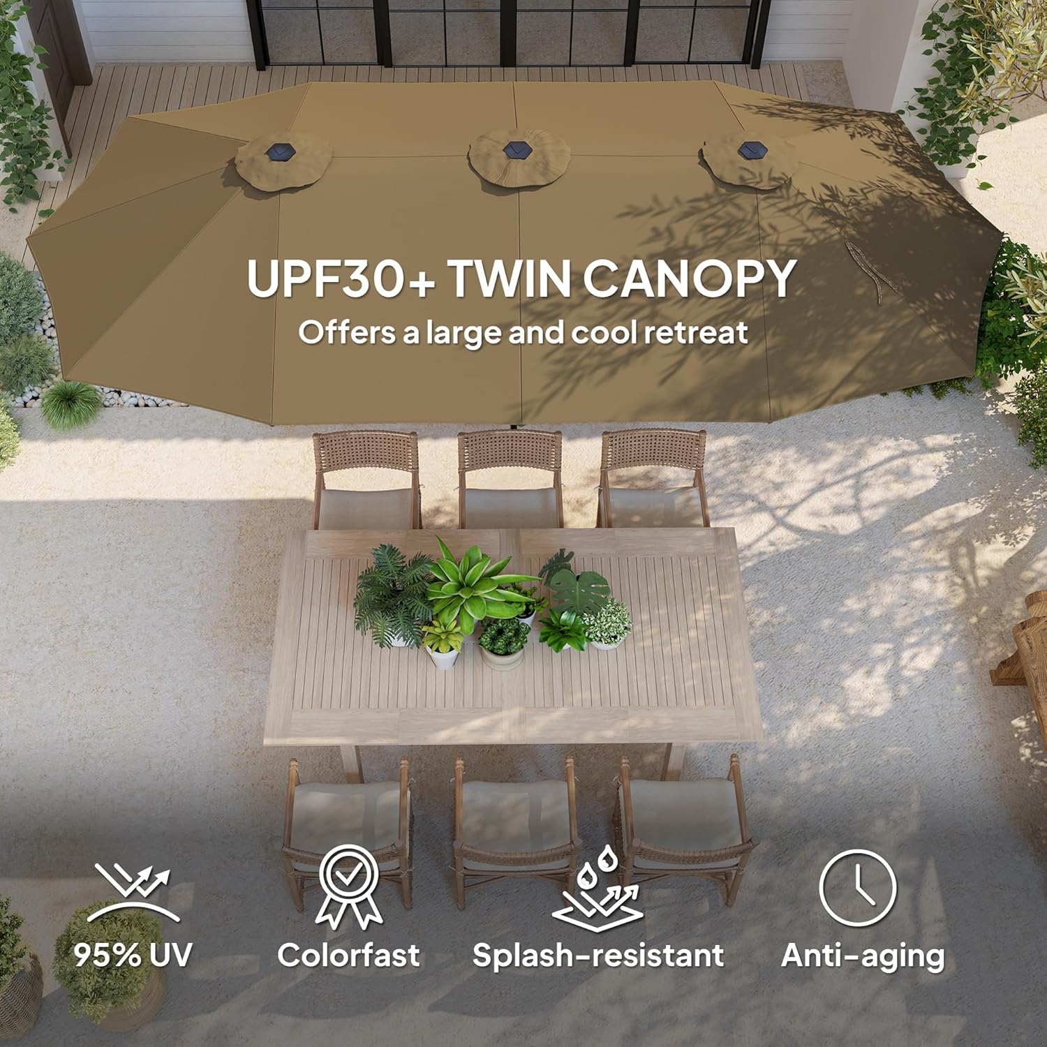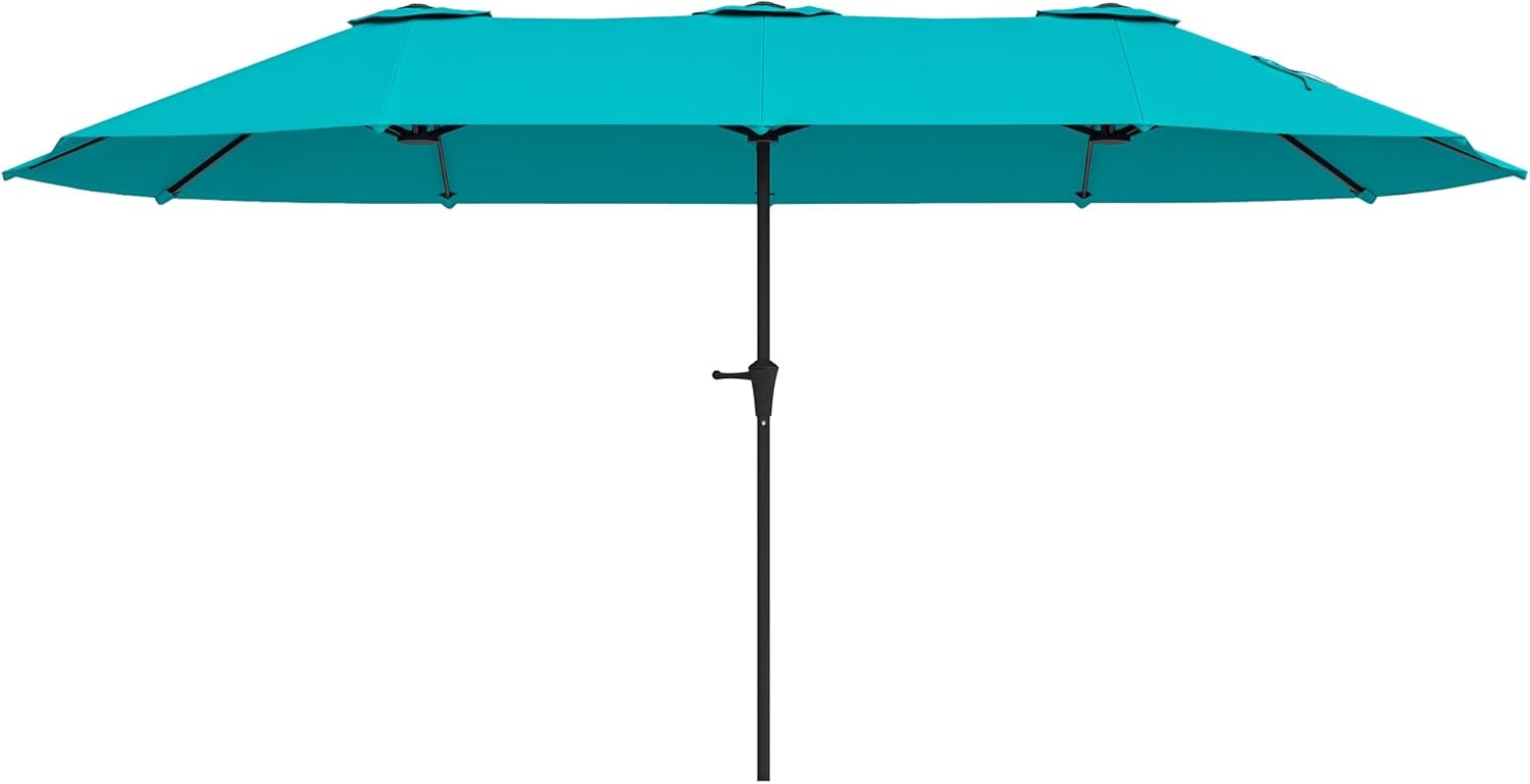 Experience sprawling outdoor shade with the Outsunny 13-foot double-sided umbrella. Crafted with UPF30+ coated 100% polyester fabric, this extra-large outdoor umbrella resists splashes and fading. Also features an easy-to-use crank lift for effortless opening and closing. Enjoy a cool, comfortable outdoor experience under this expansive canopy.